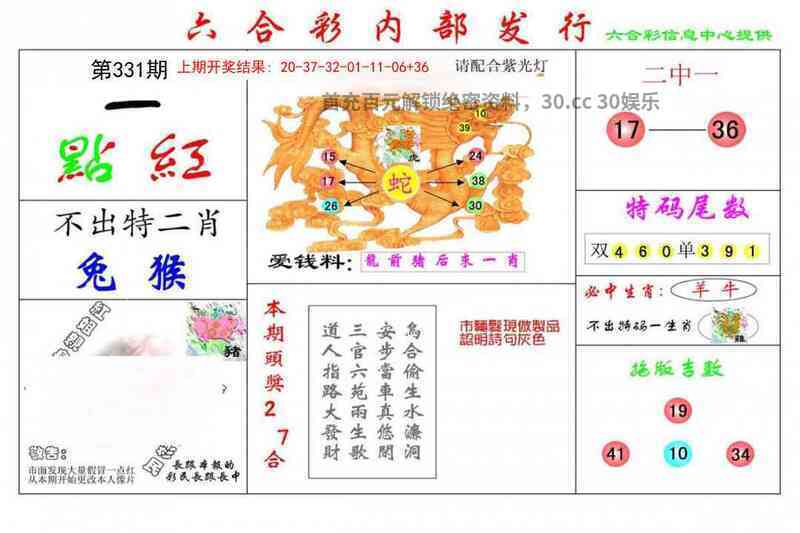 | 327期:天地+二肖〖地肖+龙猴〗开:蛇37准 |
